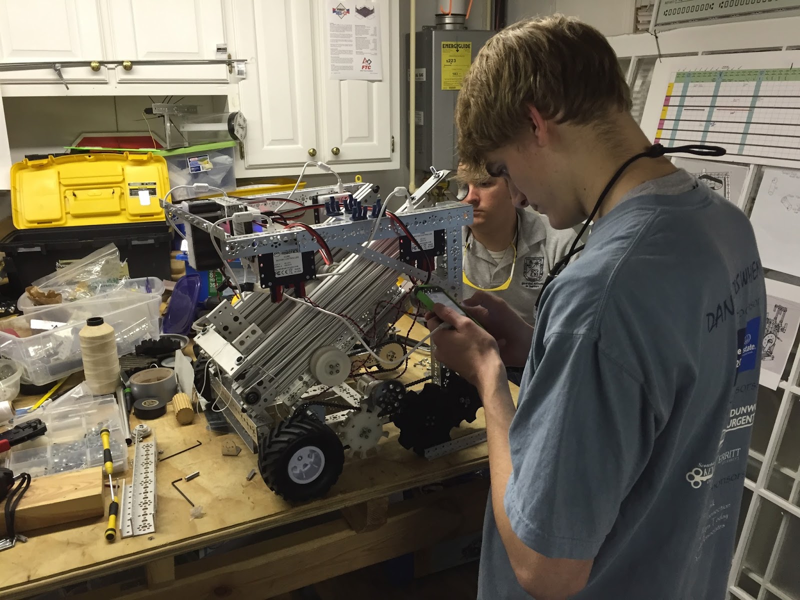 On the morning of the competition, we drove to Maxwell, where the competition was being held, and set up shop in our own booth. We had inspection and setup done quickly so that we would have time to look at the robot and make any repairs that would be needed in the future. Before we could start the robot matches, we would have to go into a room for judging. There we would tell the judges all about our season, what we did, and how we did it. We made sure to include as much detail as possible without going over the time limit. They like to see a lot of outreach and creative innovation for ideas on the robot.